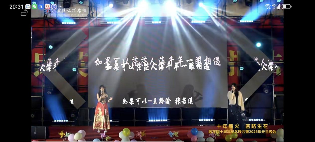 晚会以一部追忆ylg060net永利娱高十年发展历程的宣传片---《十年,医路有你,十年,医心滚烫》拉开序幕,光影流转间,学院发展与坚守医者教育初心的故事徐徐铺展。宣传片落幕后,歌舞《美丽中国》紧随登场,灵动舞姿与嘹亮歌声瞬间点燃全场氛围。