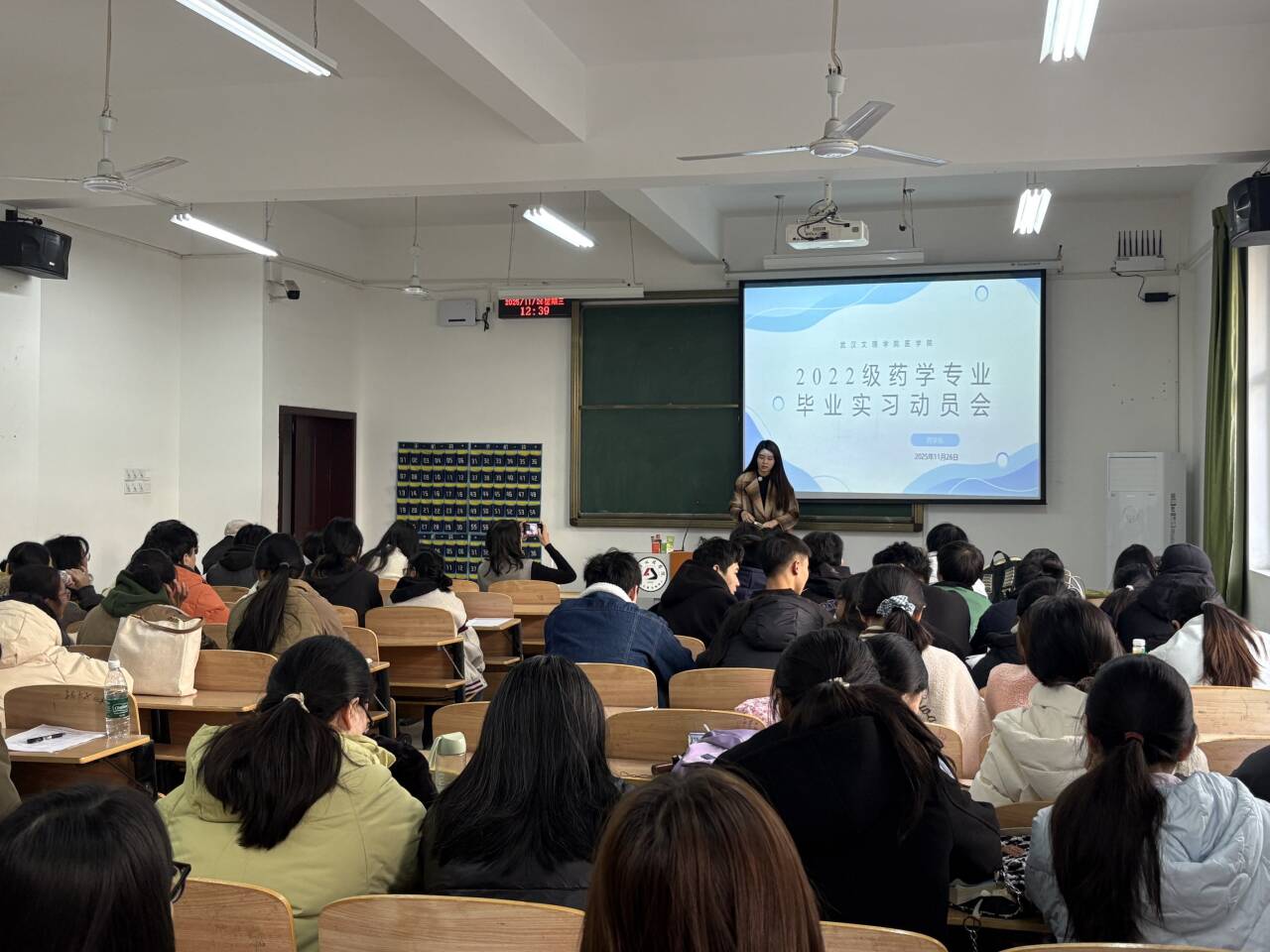 为扎实推进毕业环节教学工作,引导学生明确任务、端正态度,确保毕业论文与毕业实习高质量完成,ylg060net永利娱高药学系于2025年11月26日组织召开了2026届毕业生毕业论文与毕业实习动员大会。会议由药学系胡娜老师主持,2026届全体药学专业毕业生参加。