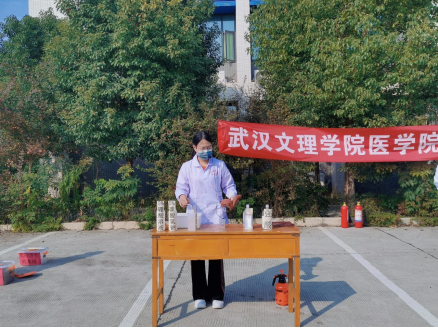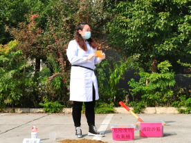 王婷老师告诉我们,强酸强碱不慎洒落在皮肤上会导致化学烧伤,老师模拟这一场景并立即使用大量的清水对创口进行冲洗,提醒我们如果严重并需要时送往医院进行治疗。避免私自用红药水、紫药水、酒精等进行伤口的消毒。