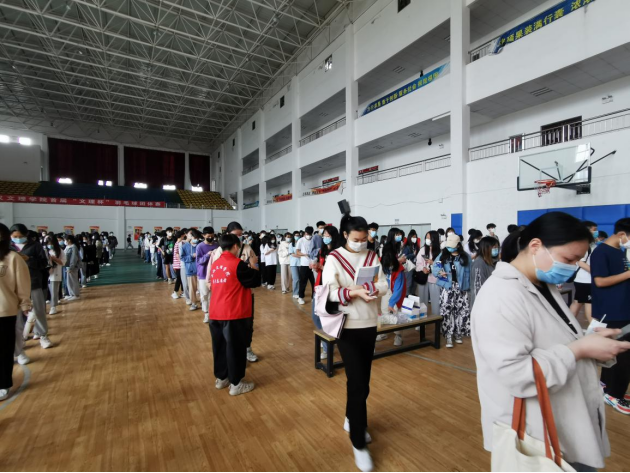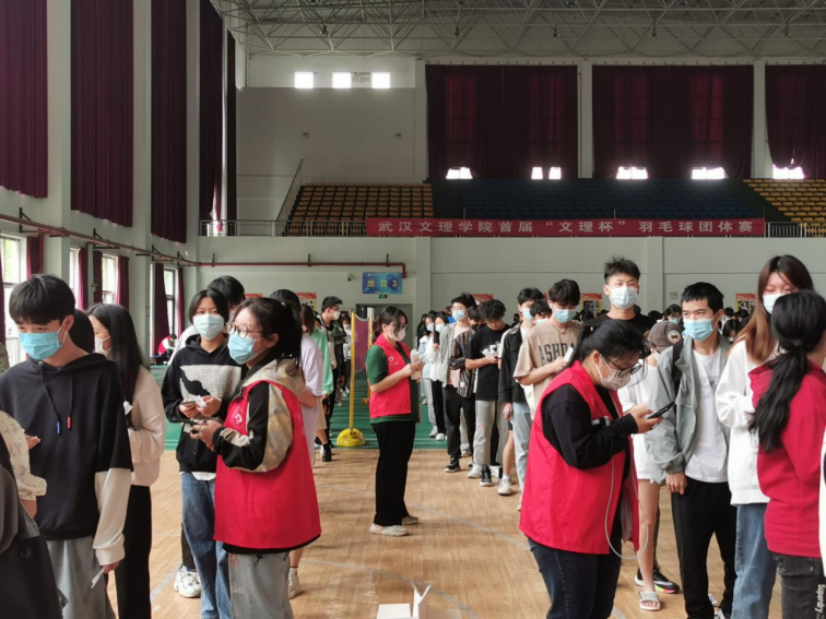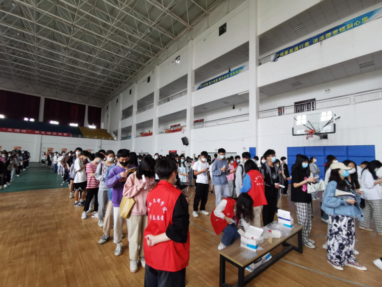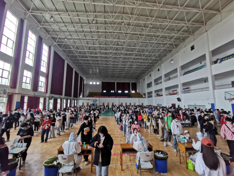 在进入体育馆的内部后,可以看见十支核酸检测队伍,凃君老师带领二十多名志愿者各司其职,将各组待检人员分别引入核检区,维持人员单向流动,保证一米安全距离。