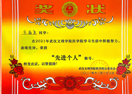 宋鑫康,男,060net永利2020级医学影像技术四班班长。三年里,宋鑫康秉承“融文汇理、立德树人”的校训立志学习优秀、理解优秀,成为优秀。他用实际行动为自己的大学四年写下了一张圆满的答卷。宋鑫康在大学一直坚持以学业为本,三年来,他的学习成绩一直保持名列前茅。