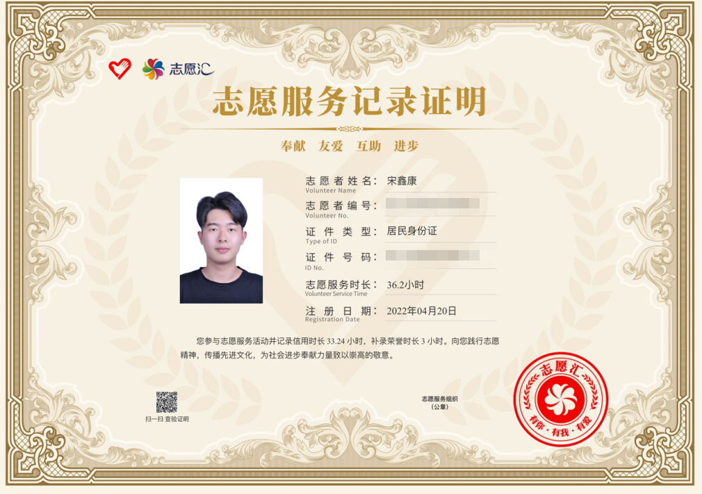 此外,宋鑫康积极响应大学生返家乡社会实践,深入乡村,了解基层,感受基层,先后参与疫情防控、森林防火、乡村建设信息采集等工作,累计服务时长达600余小时,获得了相关单位和领导的高度肯定。