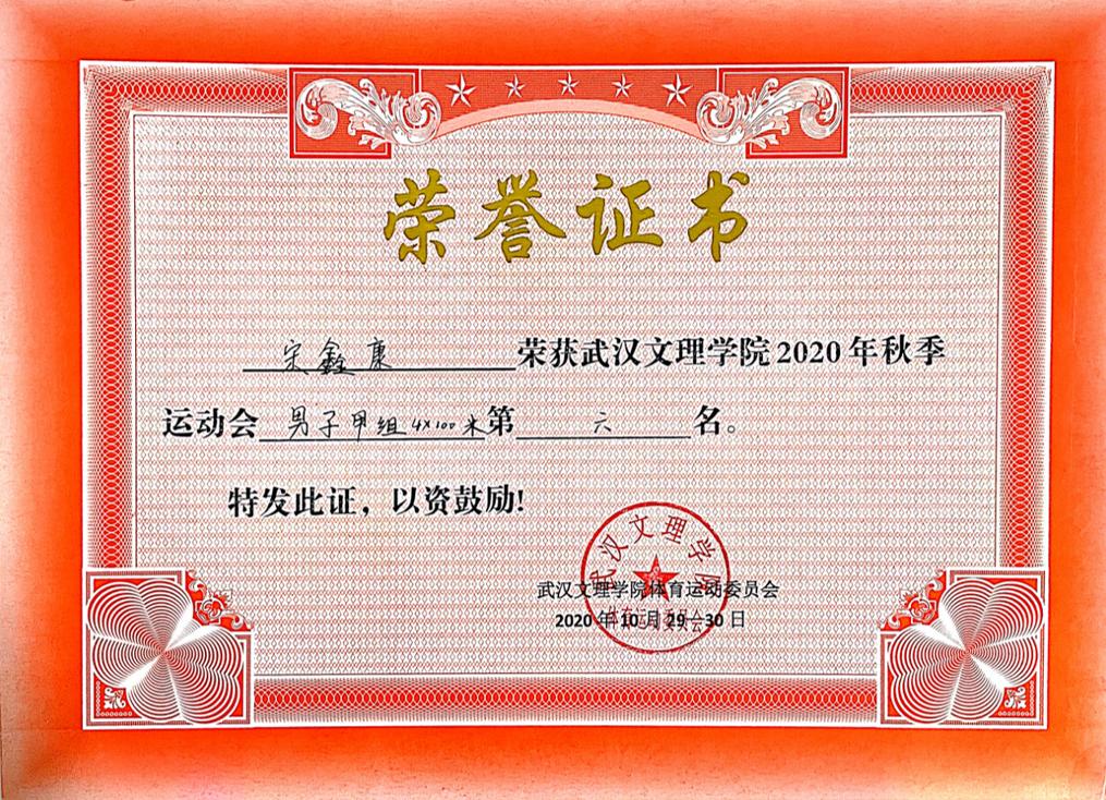 宋鑫康的学习成绩从大一成绩年级第四到大二、大三学年成绩年级第一,综合成绩和专业成绩第一。三年来,他连续两年荣获一等奖学金、优秀学生干部标兵称号,精神文明奖,连续三年荣获“优秀学生干部”称号。2022-2023学年,宋鑫康因学习成绩突出荣获校“和润单项奖”。