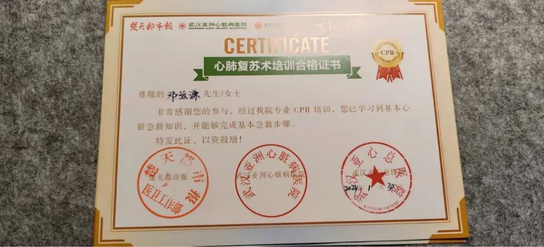 实操训练后,我怀着忐忑不安的心情接受现场示范演练和考核评审,默记老师教导的急救“一拍二呼三叫”口诀,即在进行急救时,首先应该拍拍患者的双肩,然后喊话,询问患者的情况,如“朋友你怎么了,快醒醒”。接着,应该触摸患者的颈部,检查是否有动脉搏动。如果以上步骤均无效,即患者没有反应且无脉搏,那么可以明确患者心脏骤停,此时应立即实施抢救措施。幸运的是,我在身穿蓝色护士服老师的指导下,顺利通过了考核,获得了医院颁发的“心肺复苏培训合格证书”。