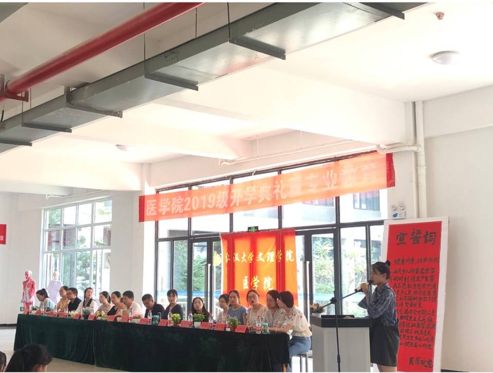 大会最后一项,由涂君老师带领313名形式宣誓,“健康所系,性命相托……”,全体医学生庄严宣誓,承诺着对祖国医药事业的决心,表达着自己对医学事业的憧憬。新生们用自己的誓言表达了自己对于医学的热忱以及美好寄愿。会场充满了青春的活力与魅力。