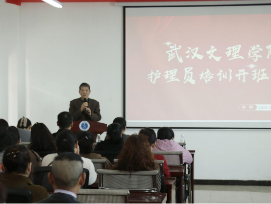 艾永循院长致辞,他热烈欢迎首批护理员培训班学员参加培训,表示此次培训是落实省委省政府'十四五'卫生健康规划的实战举措,利国利民,意义重大。他强调,此次培训学员通过考核后将获得由省卫健委颁发的“医学护理员资格证”,这是今后在湖北省从事护理陪护工作的必备条件。060net永利作为护理员培训基地,是经过省卫健委的严格审核,2024年6月成功获批,成为全省首批五十家护理员培训单位中唯一获批的民办高校,护理员培训资质获评离不开学校一流的护理员培训条件、强大的师资力量。未来将依托“学校-医院-企业”三方协同创新模式,形成护理员“招生-培训-管理-使用-考核”闭环管理模式,通过系统化、标准化的专业培训,推动护理员持证上岗,为湖北省护理行业培养高素质、标准化的专业护理员队伍。