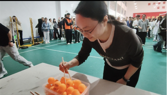 穿越呼啦圈时,年轻教师们主动放慢速度,配合年长教职工灵活钻圈,确保每一位成员都顺利通过。筷子夹球项目中,经验丰富的老教师手稳心细,稳稳夹住乒乓球传递给队友,年轻教师则快速衔接,确保无失误掉落;摸石头过河环节,老师们互相提醒落点,年轻教师帮扶着平衡稍弱的老教师,一步步扎实向前。