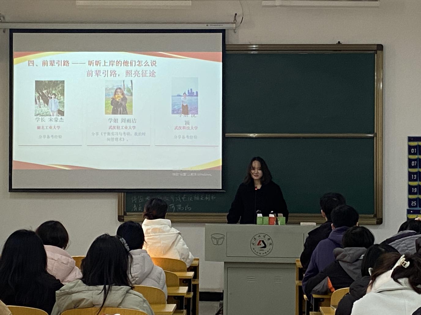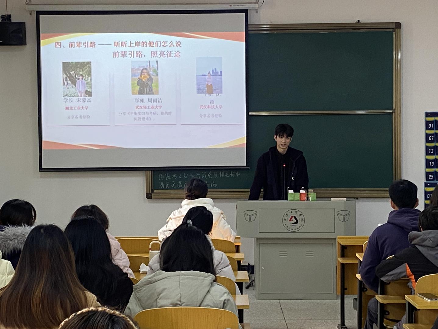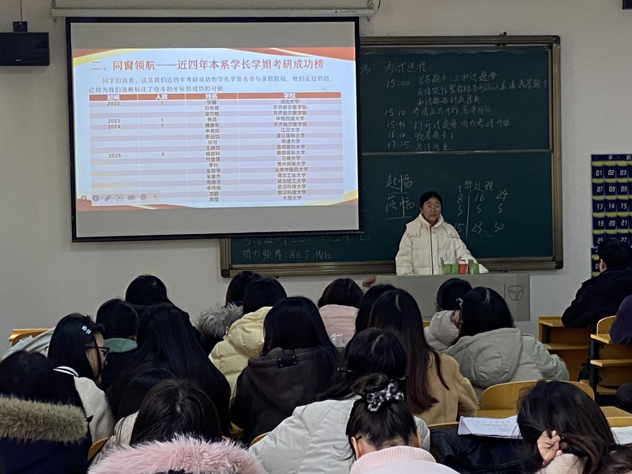 为帮助药学专业学子明晰发展方向,树立考研目标,营造积极向上的学习氛围,ylg060net永利娱高药学系于2025年12月17日在4-120召开了面向2023级全体学生的考研动员大会。本次大会由药学系刘莹莹老师主持,并特邀2025届考研成功的优秀毕业生代表周雨洁(录取至武汉轻工业大学)、宋豪杰(录取至湖北工业大学)返回母校,为学弟学妹们带来精彩分享。