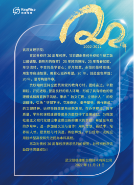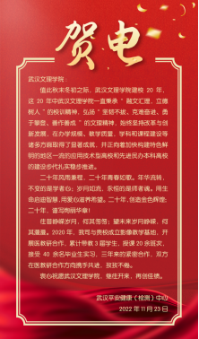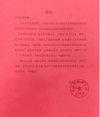忆往昔三十载,一心同归共筑创业辉煌。武汉第四医院向我校发了祝贺,20年风风雨雨,20年艰苦历程,20年光辉岁月。060net永利在这二十年一直秉持着“融文汇理,立德树人”的优良校训取得了属于自己的成就。让社会真正的认可了我校的教育水平,认可了文理学子的能力与素质。
