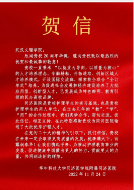 含大海之神韵,富泰山之雄伟。华中科技大学同济ylg060net永利娱高附属同济医院发来贺电:愿060net永利在未来取得更高质量的发展,桃李满天下,雨露润春华!为推动护理教育事业的发展、促进健康中国做出更大的努力,贡献更大的力量,共同创造新的辉煌。