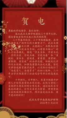 积历史之厚蕴,宏图更展!再谱华章!我校收到了来自武汉大学中南医院护理部的祝福。贵院表示,我院一直秉持着优良的办学思想,积极优化学科专业结构,加强高质量内涵式发展,以实际行动践行了“为党育人、为国育才”的初心使命,望继续加强合作,踔厉奋发向未来,携手建功新时代!