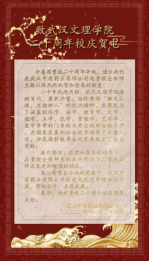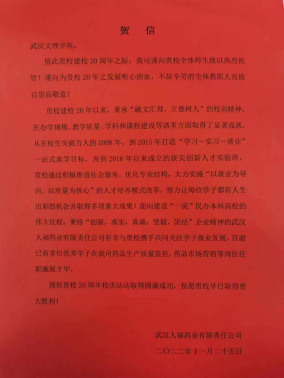 路漫漫其修远兮,吾将上下而求索。武汉中有药业有限公司发来贺电:愿我校迎来更加辉煌的明天,与贵公司加强沟通,密切合作,共同发展。让蓬勃发展始终描绘我们脚下的土地,让美好阳光洒向文理校园的每一个角落。