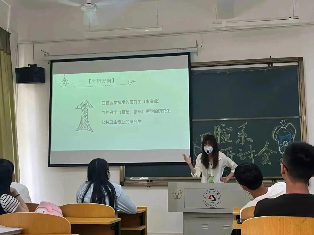 最后,周静老师为想继续深造发展考研的同学们解答了相关困惑。考研考试科目包括思想政治理论、英语、口腔医学技术综合三门课,方向包括口腔医学技术、口腔医学、公共卫生、基础医学等学科。周老师着重强调,本专业与其他专业不同之处在于专业课多采用院校自主命题,因此专业课相关资料应成为同学们的重中之重。